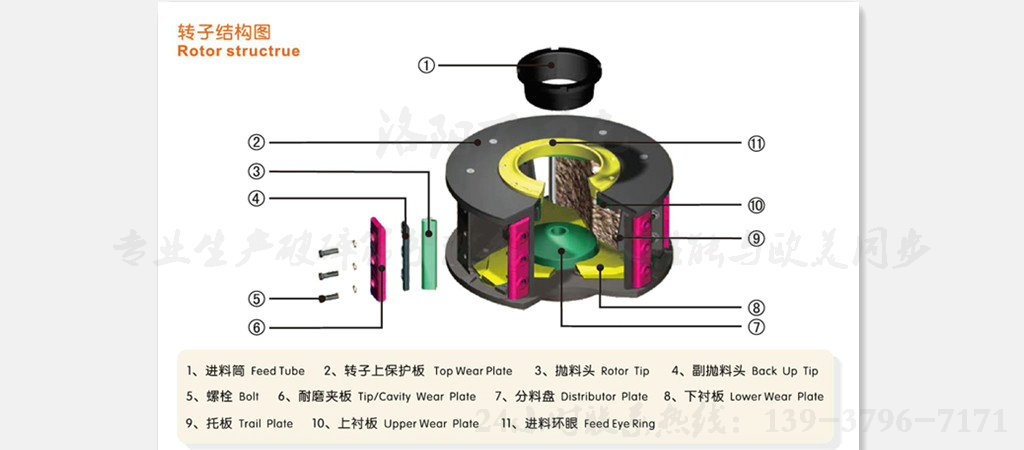 物料由進料斗進入立軸沖擊式破碎機,經(jīng)分料器將物料分成兩部分,一部分由分料器中間進入高速旋轉(zhuǎn)的葉輪中,在葉輪內(nèi)被迅速加速,其加速度可達數(shù)百倍重力加速度,然后以60-70米/秒的速度從葉輪三個均布的流道內(nèi)拋射出去,首先同由分料器四周自收落下的一部分物料沖擊破碎,然后一起沖擊到渦支腔內(nèi)物料襯層上,被物料襯層反彈,斜向上沖擊到渦動腔的頂部,又改變其運動方向,偏轉(zhuǎn)向下運動,從葉輪流道發(fā)射出來的物料形成連續(xù)的物料幕。這樣一塊物料在渦動破碎腔內(nèi)受到兩次以至多次機率撞擊、磨擦和研磨破碎作用。被破碎的物料由下部排料口排出。在整下破碎過程中,物料相互自行沖擊破碎,不與金屬元件直接接觸,而是與物料襯層發(fā)生沖擊、磨擦而粉碎,這就減少了角污染,延長機械磨損時間。渦動腔內(nèi)部巧妙的氣流自循環(huán),消除了粉塵污染。